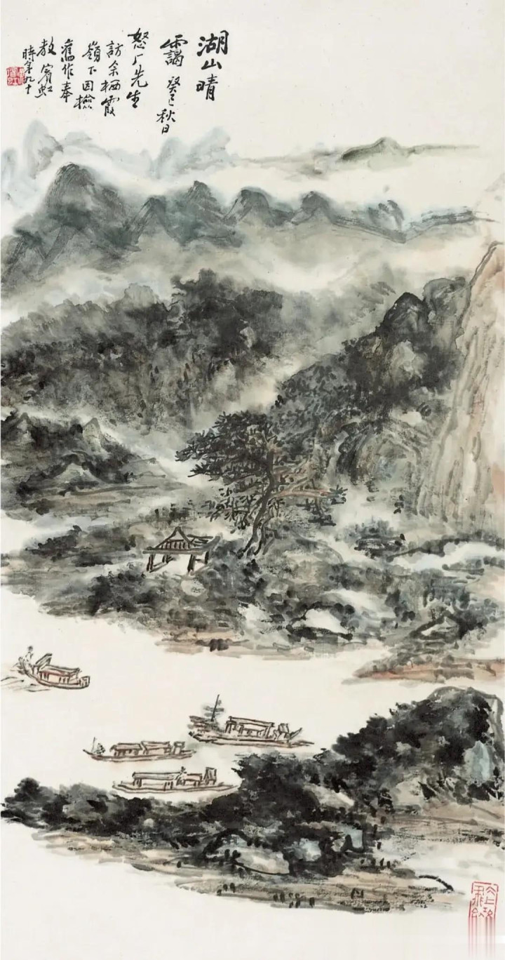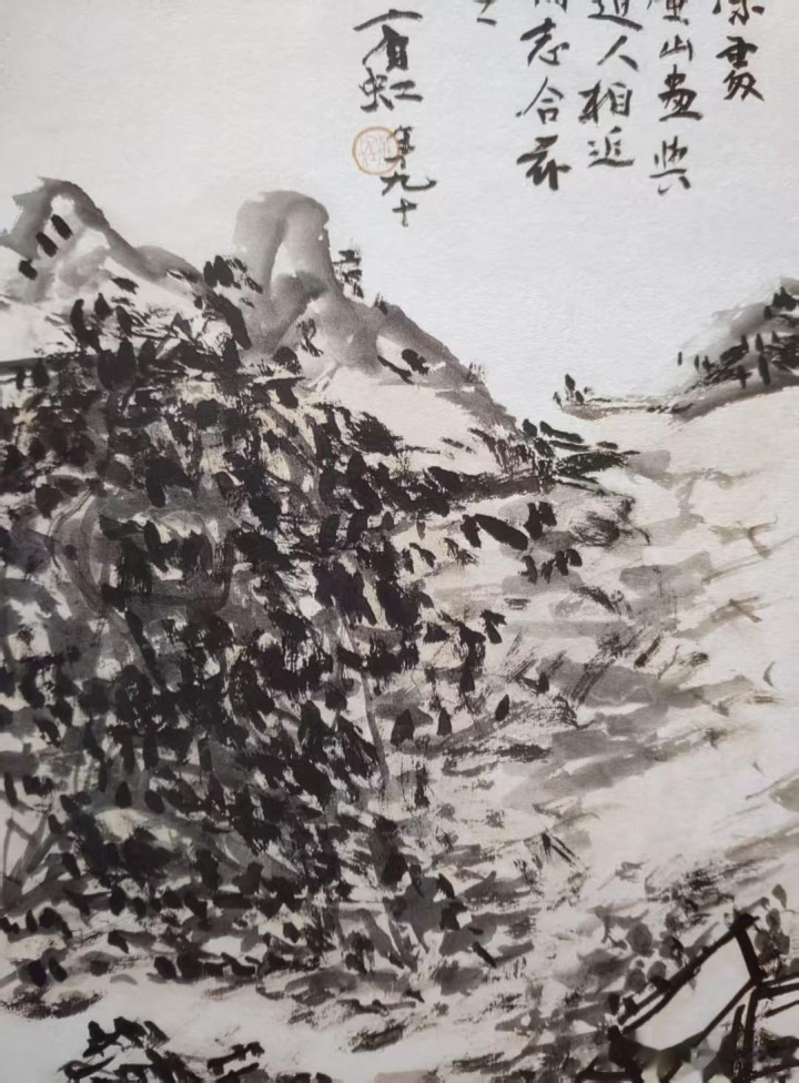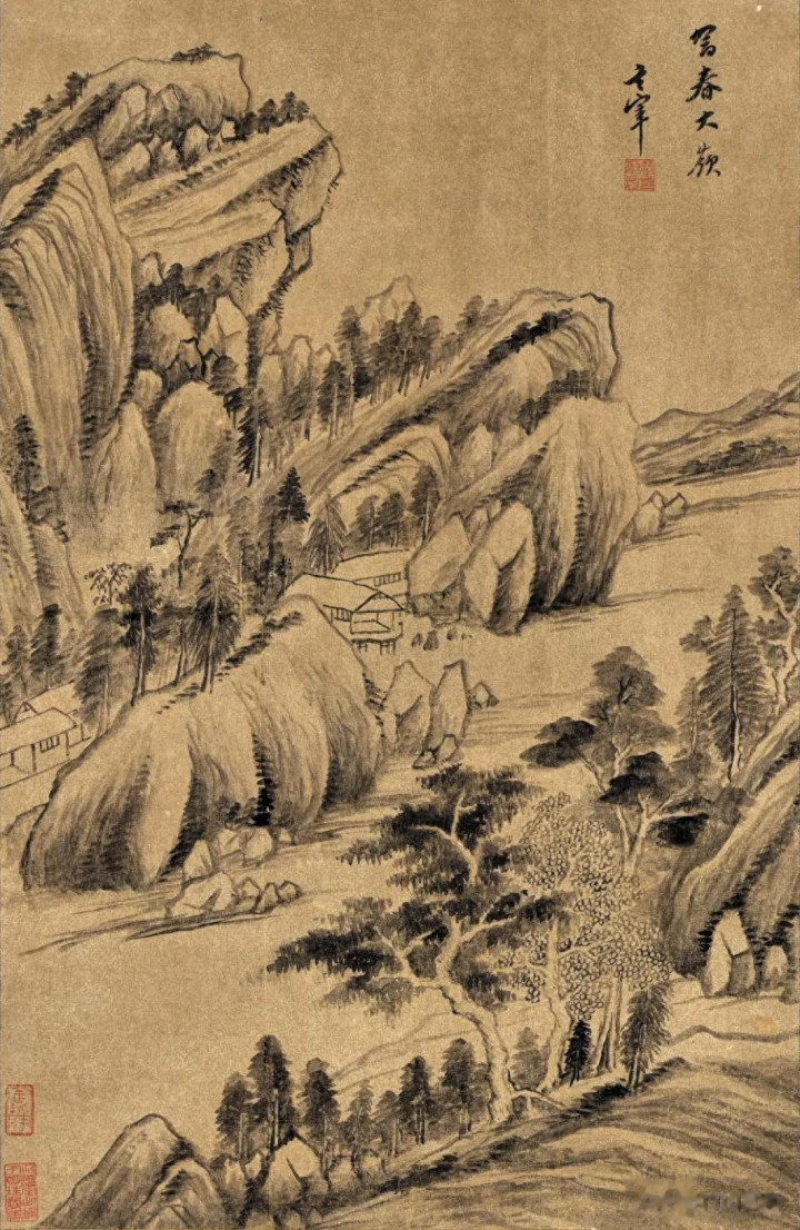近树、中山、远峰互相渗透、墨色交融、不分前后,远近混沌贯通。