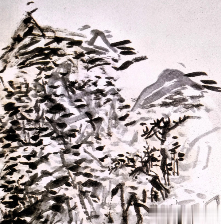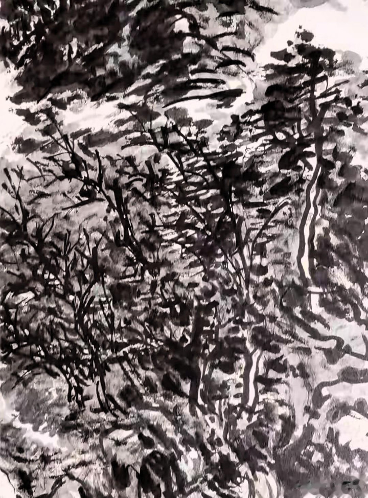 大师晚年简化外形,所画山非真山、树非真树。弱化轮廓,淡化具象立体,强化笔墨骨架、阴阳开合,点线交织,浑沦一体。
