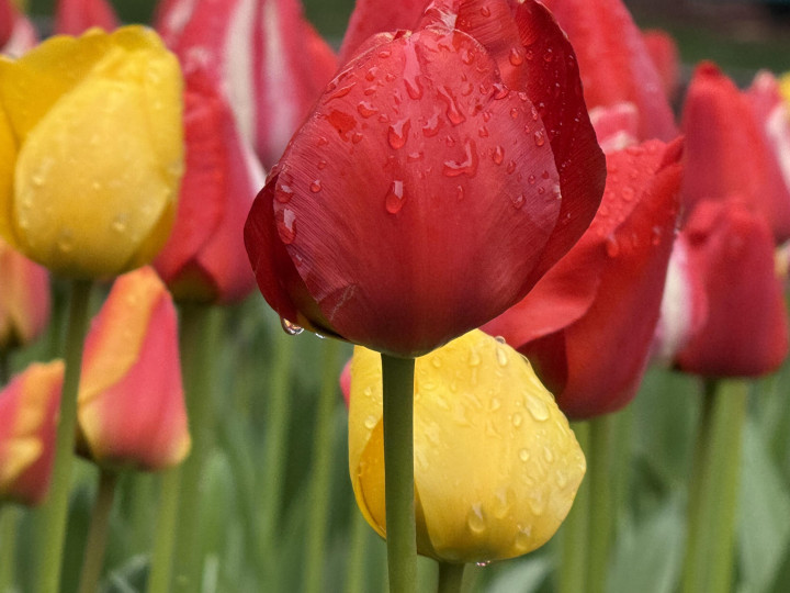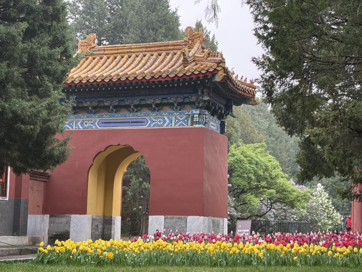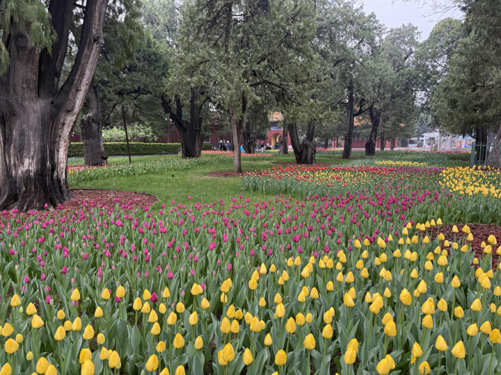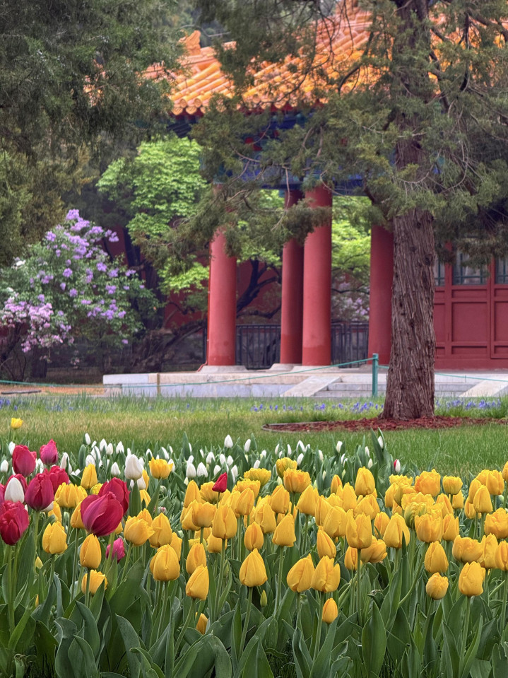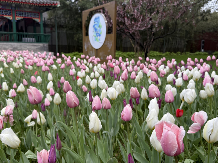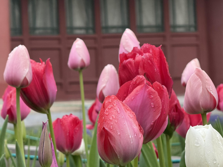 雾色中中山公园郁金香含苞待放,在露珠中摇曳多姿,散发着迷人的气息。
