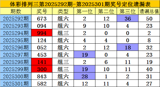 开奖回顾:排列三第2025301期奖号为:582,各位号码遗漏值分别为12、11、4,遗漏总值为27。