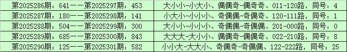 统计排列三已开出的奖号发现,在连续5期(第2025286期-第2025290)奖号为:641-180-504-685-125。