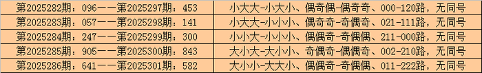 在排列三历史开奖中,第2025282期-第2025286期连续5期奖号为:096-057-247-905-641。