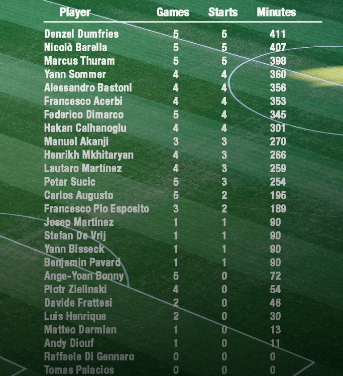 虎扑09月27日讯意甲联赛即将在周末重燃战火,数据网站也统计了国米球员本赛季的出场时间排行。