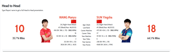 据WTT官方数据统计,双方此前交手28次,孙颖莎18胜占优。双方最近一次交手是中国大满贯,当时王曼昱4-2战胜孙颖莎夺冠。但在双方的最近十次交手中,孙颖莎拿下了八次胜利。