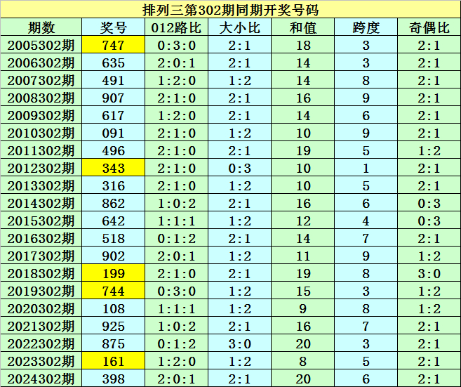 本期为排列三第2025302期开奖,开奖日期为:2025年11月12日,历史上排列三第302期已开出了20次奖号,历年同期开出号码分别为:747-635-491-907-617-091-496-343-316-862-642-518-902-199-744-108-925-875-161-398。