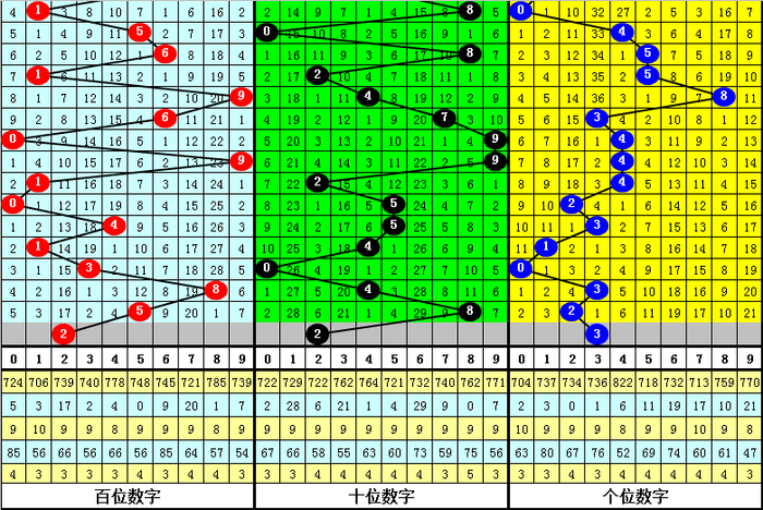 号码跨度:在第302期同期奖号中,跨度开出频次分别为:跨度3开出4期,跨度5、6、8、9开出3期,跨度7开出2期,跨度1、4开出1期,跨度0、2没有出现。去年同期开出6,本期看好跨度下降,一码跨度参考1。
