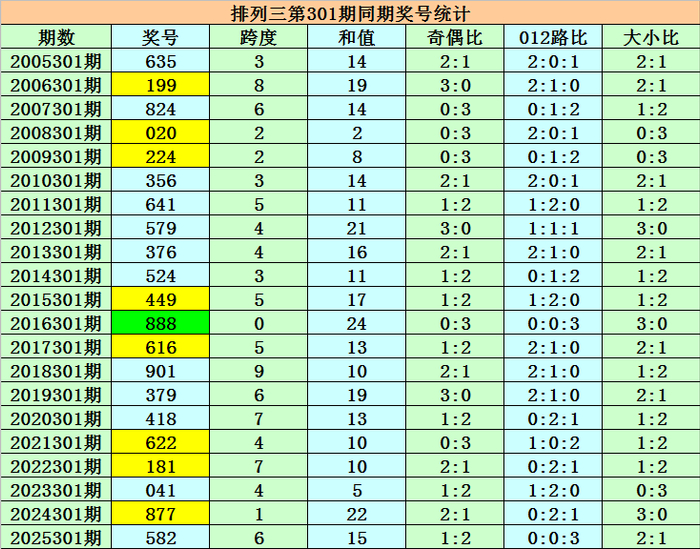号码012路比:第302期历史同期号码012路比为25:22:13,本期预计012路比开出1:0:2。