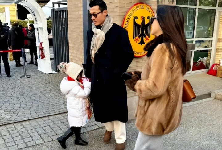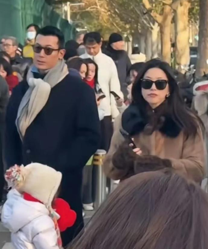 王昀佳时而弯腰为她整理帽子,时而掏出手机记录这一刻,而朱珠就在旁边边逛边看摊位。三个人挤在人群中,排队、聊天、买东西,看起来与任何一个普通家庭无异。